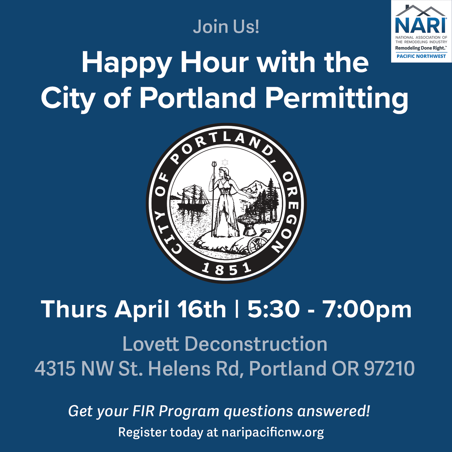 Meet Dave Tebeau and others from the City of Portland Permitting Department. Dave will give a status update and answer questions about the current department and the FIR program.