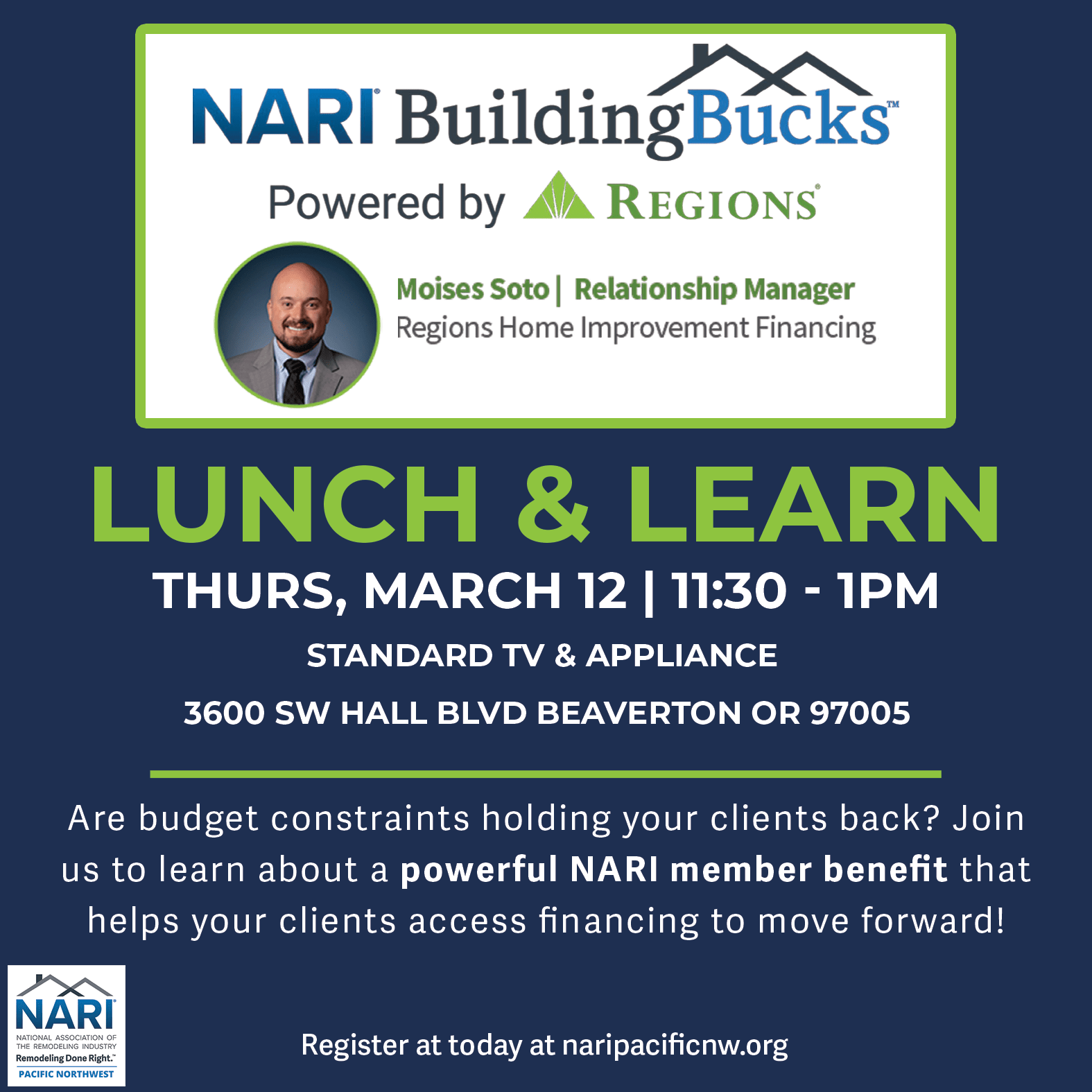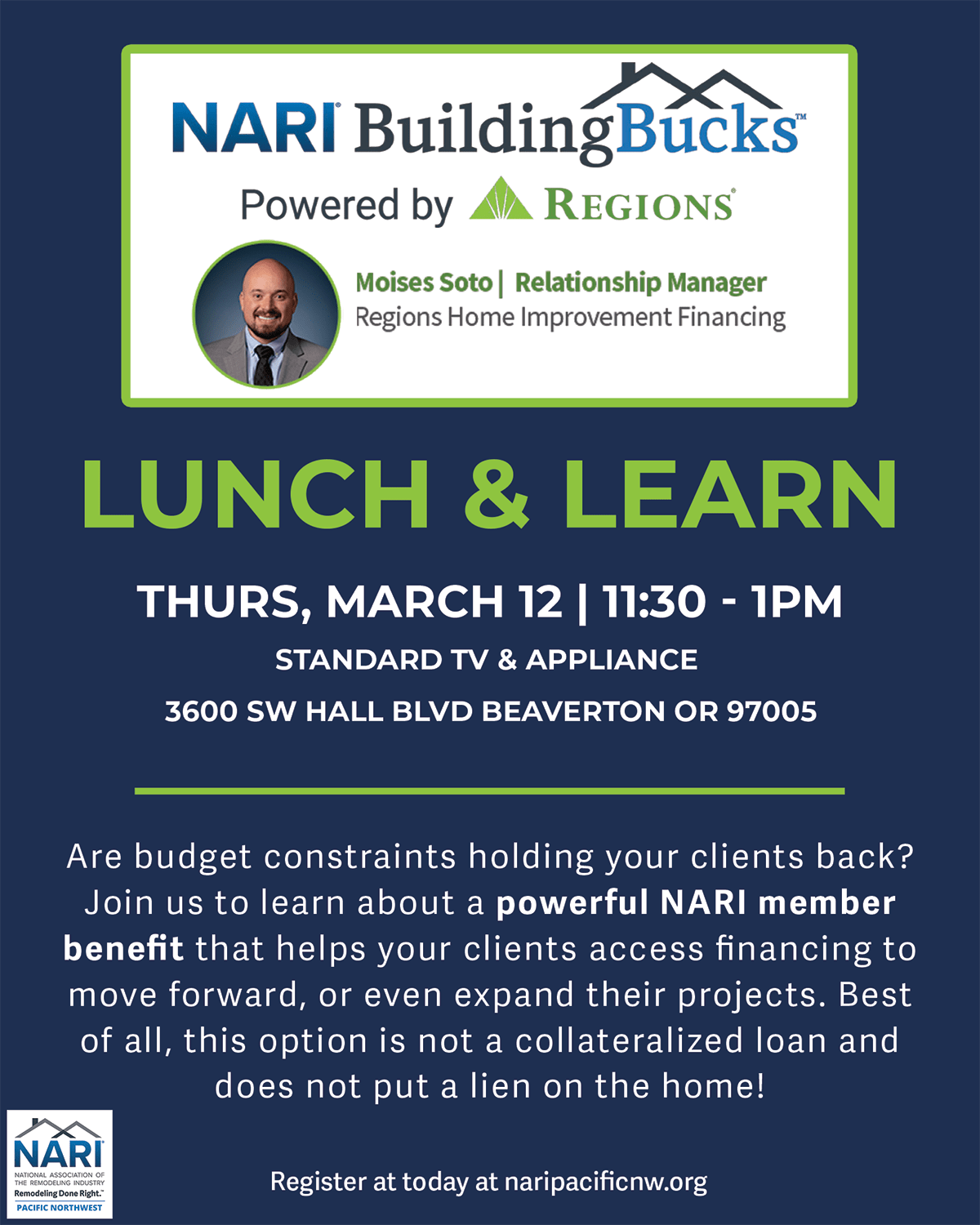Having trouble finding clients with cash for a project or they want to do more but don't have the cash to do it? Join us for a comprehensive presentation on a NARI member benefit that offers your clients financing to do that project or make that project bigger! This option is NOT a collateralized loan and does not put a lean on the house.Images