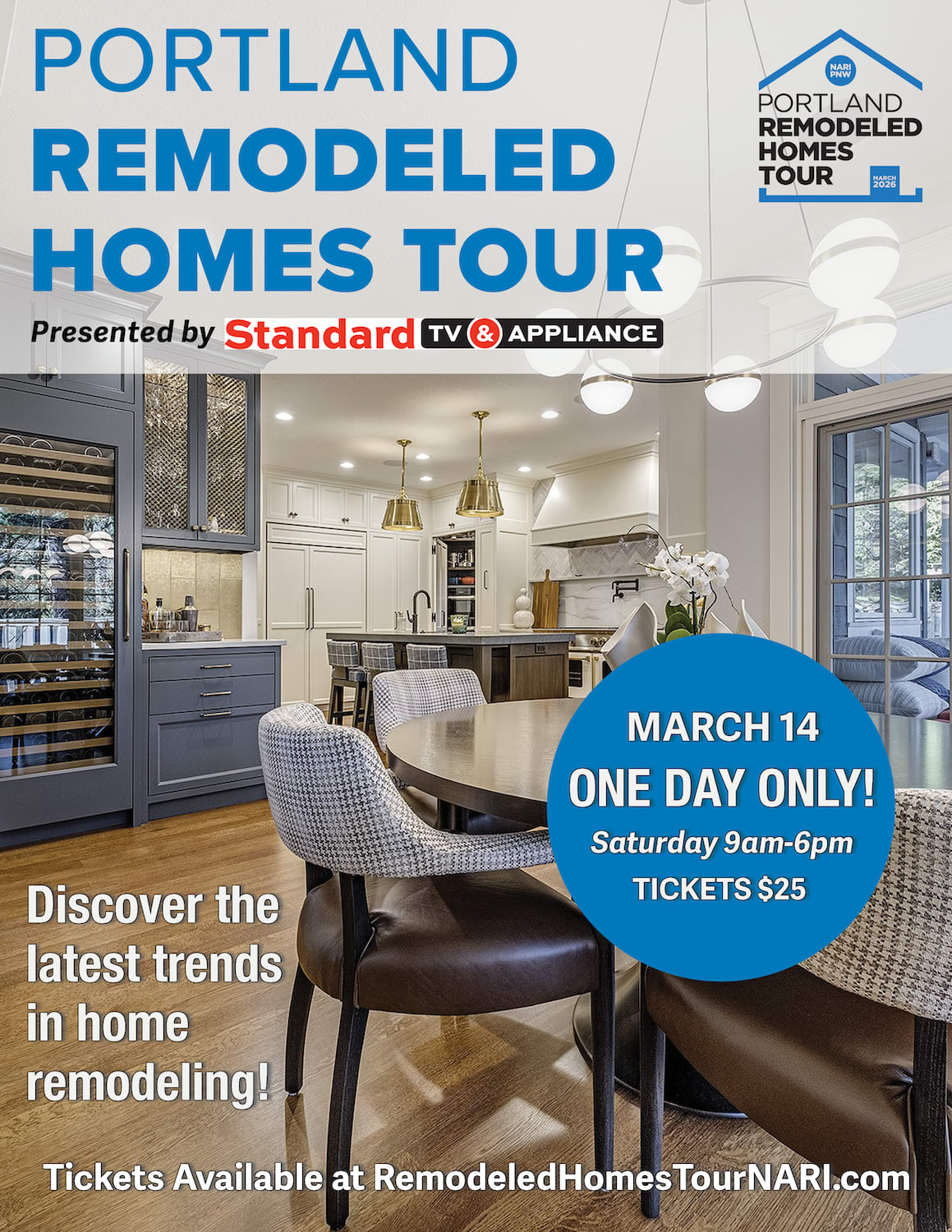 Presented by Standard TV and Appliance the National Association of the Remodeling Industry Pacific NW chapter Remodeled Home Tour is the year's most stunning tour of homes in the Portland Metro area. Discover the latest trends in home remodeling! Join us March 14th to see outstanding remodeled homes in the Portland Metro Area featuring NARI Pacific NW’s finest residential remodelers and meet the remodelers behind the work! You will be able the to tour newly remodeled areas of local homes to spur inspiration in improving your own home!